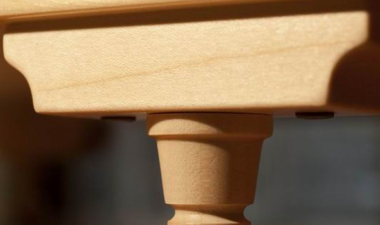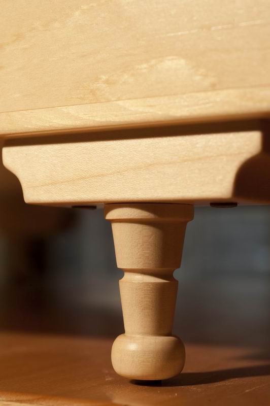 Hackbrett-Tisch mit gedrechselten Beinen. Die Beine sind für den Transport im Tisch integriert.