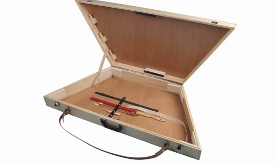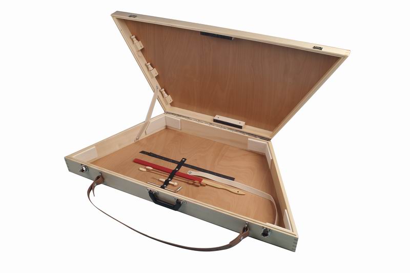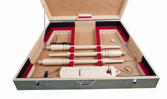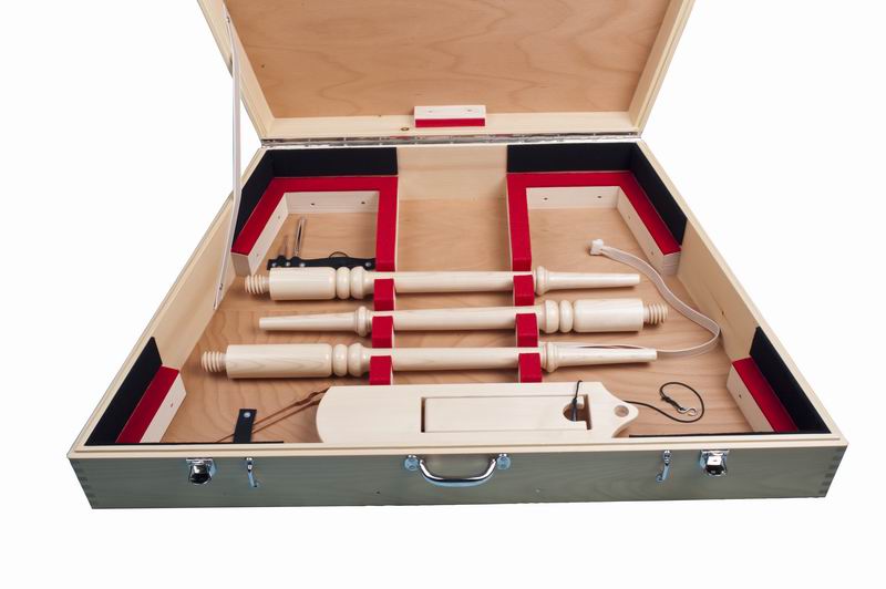 Der Koffer wird innen mit Filz und Halterungen für jegliches Zubehör ausgestattet. Die abnehmbaren Beine sind direkt am Instrument angeschraubt. Die Länge der Beine wird auf Wunsch zum Sitzen oder Stehen angefertigt.